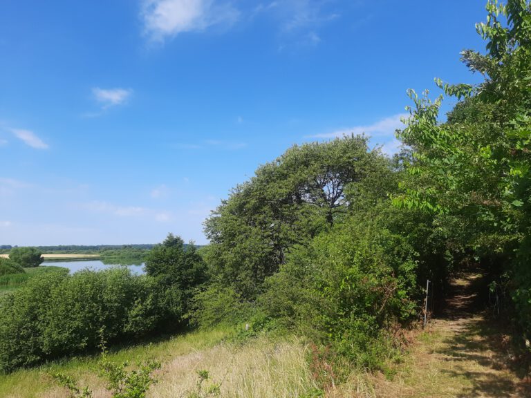 Grünflächen, Wasser in direkter Nähe und eine offene, naturnahe Gestaltung ohne künstliche Abgrenzungen.